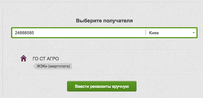 Для сосздания платежа необходимо ввести код ОКПО ГО СТ Агро, восемь цифр: 24888585. Через несколько секунд (ускорить поиск можно нажав клавишу Ввод), банк сообщит, что даный код ОКПО принадлежит "ГО СТ Агро".